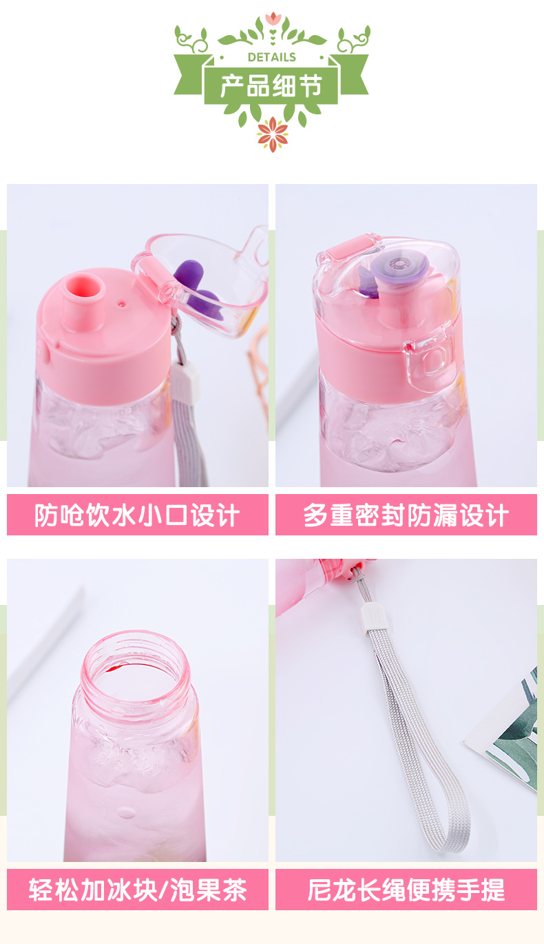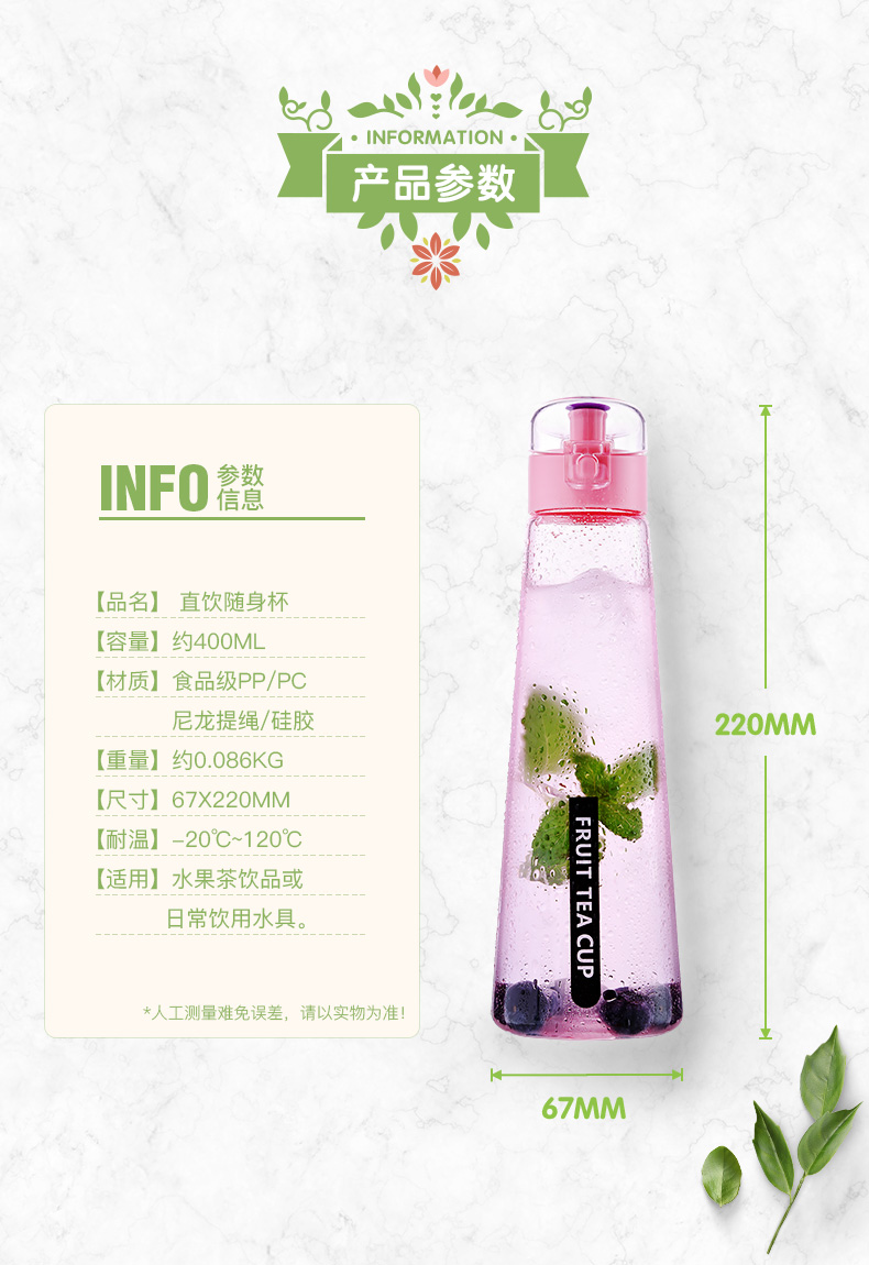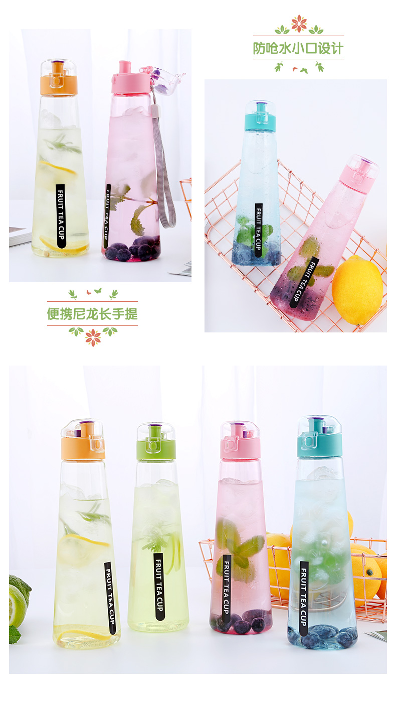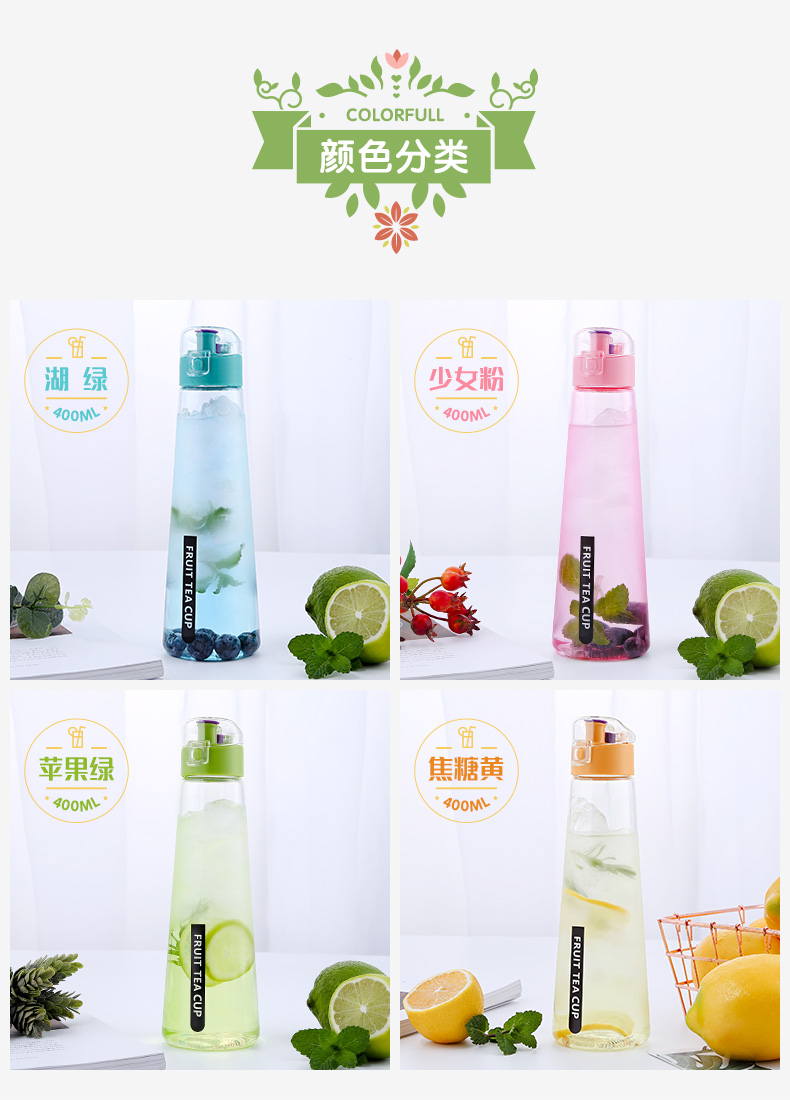 產品特點:防嗆飲水小口設計,多重密封防漏設計,輕松加冰封泡果茶,尼龍長繩攜手提,400ML 食品級PP/PC料